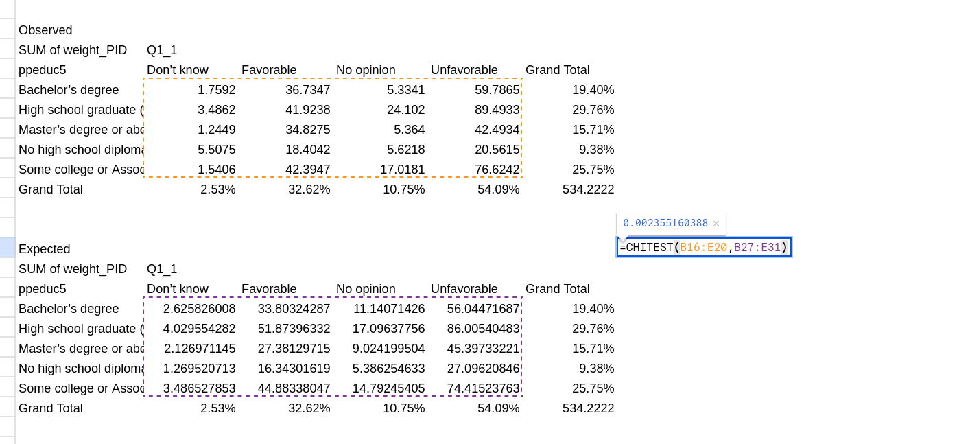 into a cell. You can then click and highlight the observed table and hit enter. Next click and highlight the expected table and hit enter. You should get something that looks like Figure 16. Once you click off the cell you’ll get your p-value.