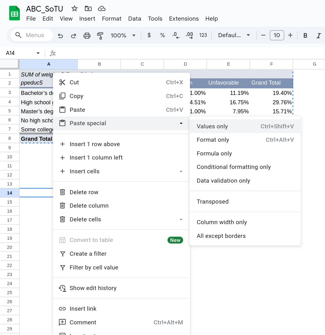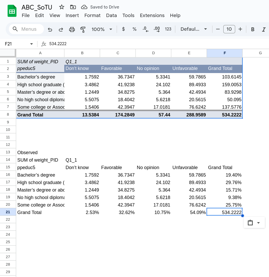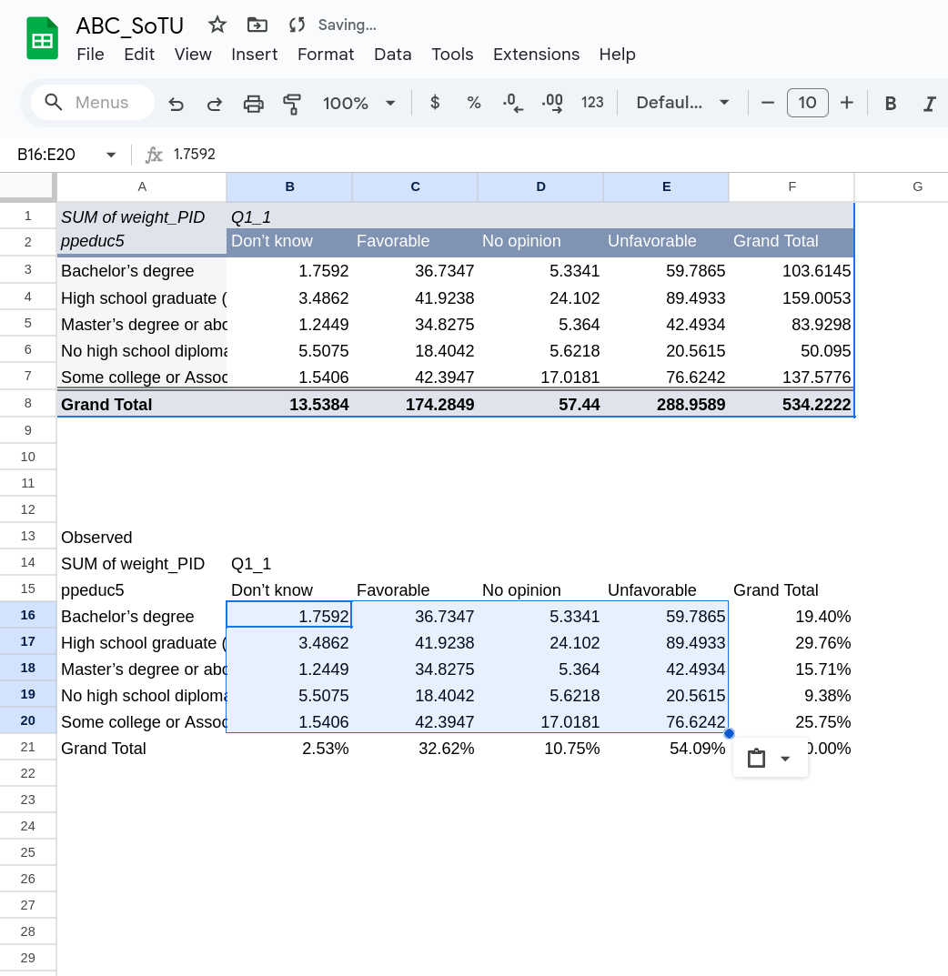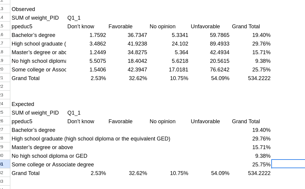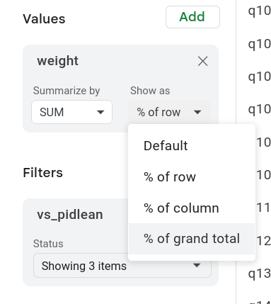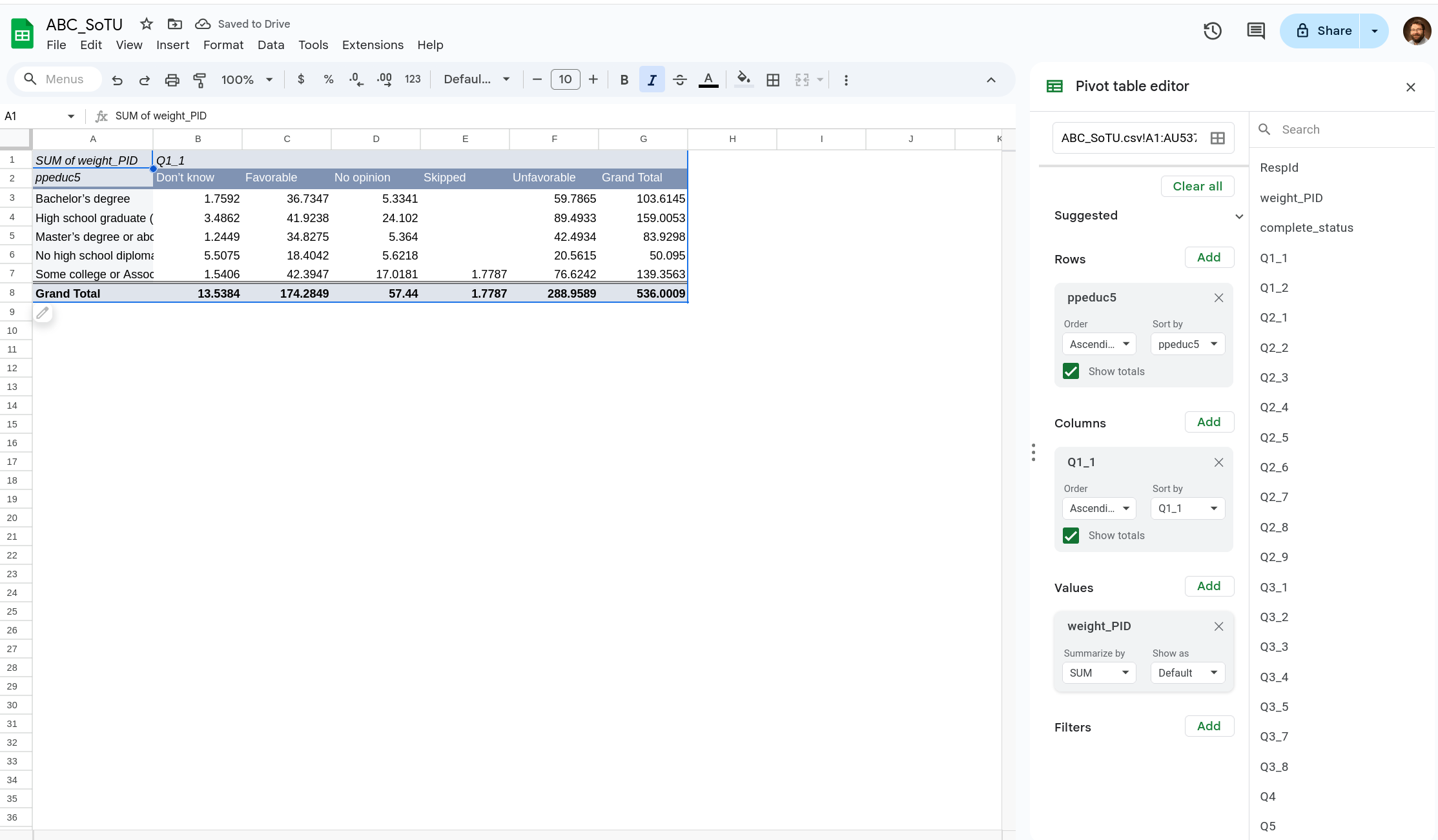 You should again start with a pivot table of your data. Previously we only used the Rows (and values) part of the pivot table, but we are going to now use the Columns options as well. You should select a variable to be along the Rows, the Columns and then add in the weight variable as the Values. In Figure 1 I selected ppeduc5