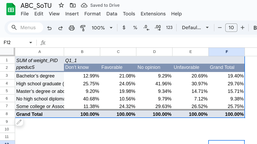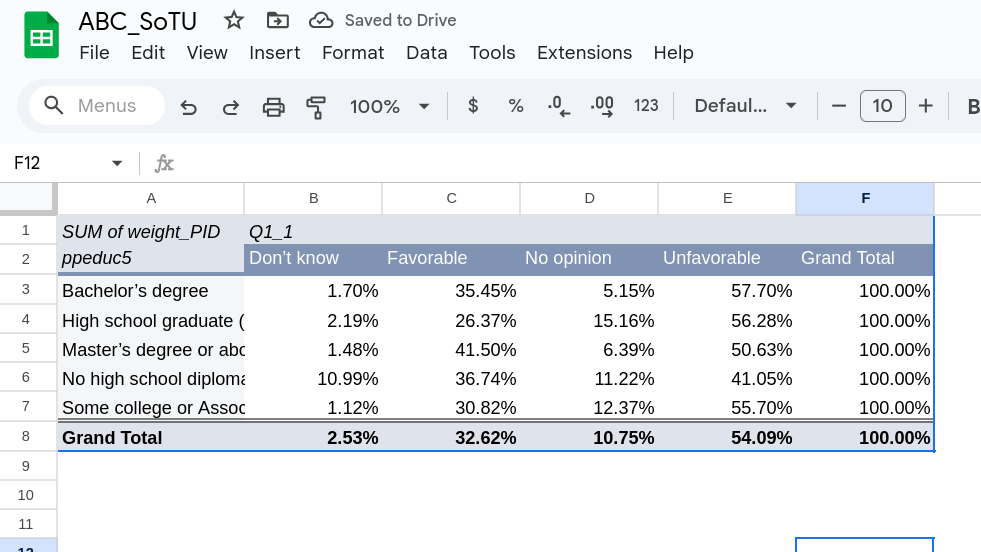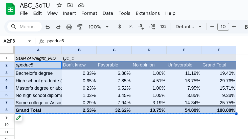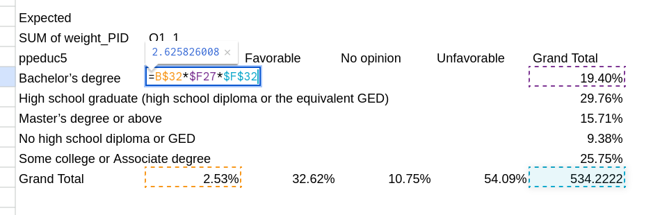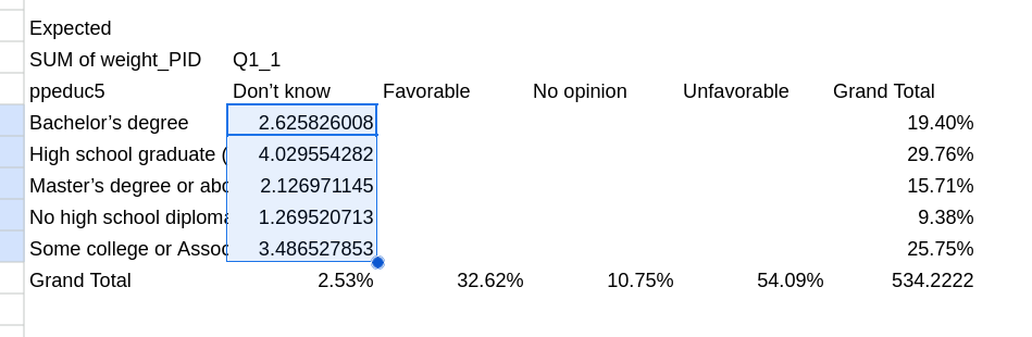 Figure 5 shows the column percentages. Here the data shows that among those who have an unfavorable view of Joe Biden, 31% are high school graduates. Among those who have favorable views, 24% are high school graduates. This might seem weird, but this is because high school graduates were a relatively large portion of the overall sample (the far right column shows this, they made up 30% of the sample).