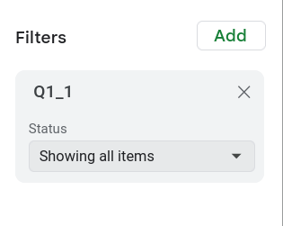 To filter your data use the Filter menu (Figure 2) on the bottom right. You can add a variable to this just like the other menus. I’ve added Q1_1