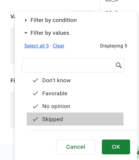 . We probably don’t want to leave it as it is in the table. We have two options, one is to recode those who said “Skip” into something else, another is to just drop the Skip responses. We will do the latter for now.