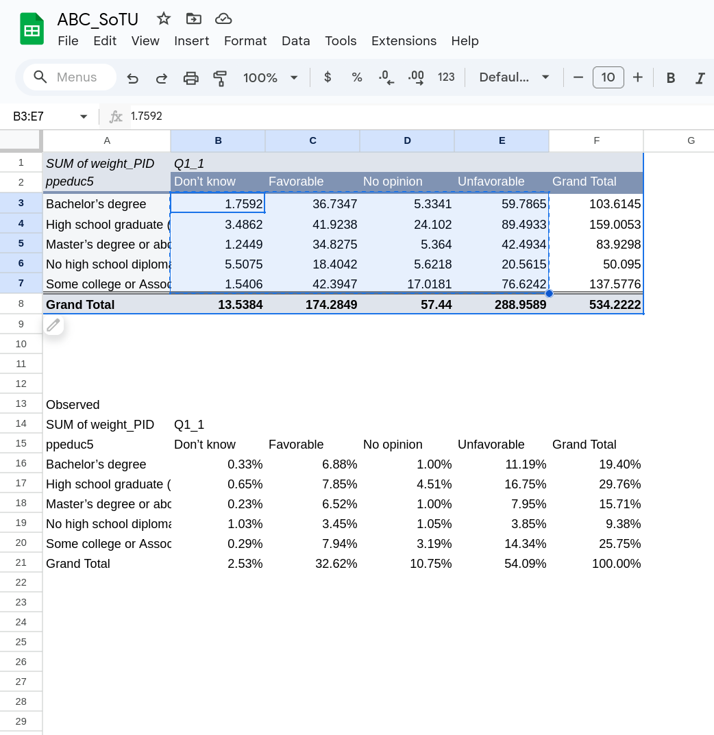 To calculate a \(\chi^2\) test we need to create our observed and expected table. I like to copy this out of the pivot table as it makes it easier to do the google sheets formula. We are going to create the observed table first with both the marginals and the observed frequency. There are several ways to do this but I find it most useful to break this into two steps. Copying the marginals over and then copying over the frequencies for the inner cells.