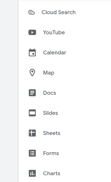 On the Google Sites editor page you should have a menu on the right. At the very bottom of that menu (Figure 1) there is the option to insert Charts. Click on that.