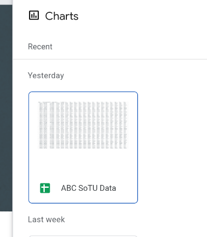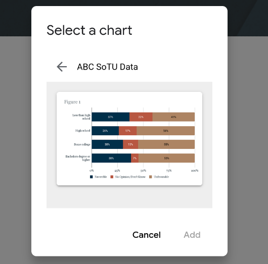 Once you click that you’ll have a popup that lets you select the Google Sheet that has the chart you want to embed (Figure 2). Select the correct Sheet and then you’ll get to select which chart to add. If you want to add multiple charts you’ll just need to start back over with the insert Chart button.