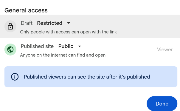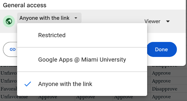 The settings are a bit annoying because I’m honestly not positive on what they need to be. The safest thing to do is to set the Google Sheet. to be viewable online by the general public (not just those logged in at Miami). You can then do the same thing for the Google Site. To change the settings for the Google Sheet click on the “Share” button and select the options similar to Figure 3 (a). For the Google Site click Publish on the top right and set the settings similar to Figure 3 (b)