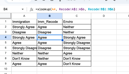 9 | Agree | =xlookup(A9, Recode!A$1:A$6, Recode!B$1:B$6) | Don't Know |