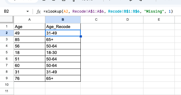 2 | 49 | =xlookup(A2, Recode!A$1:A$6, Recode!B$1:B$6, "Missing", 1) |