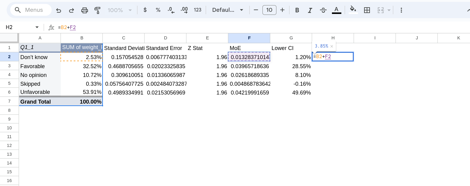In order to calculate the Margin of Error and 95% CI we are going to use Google Sheets formulas. These formulas allow you to reference other cells and apply different functions to them. The simplest version would be something like = A5 + B4