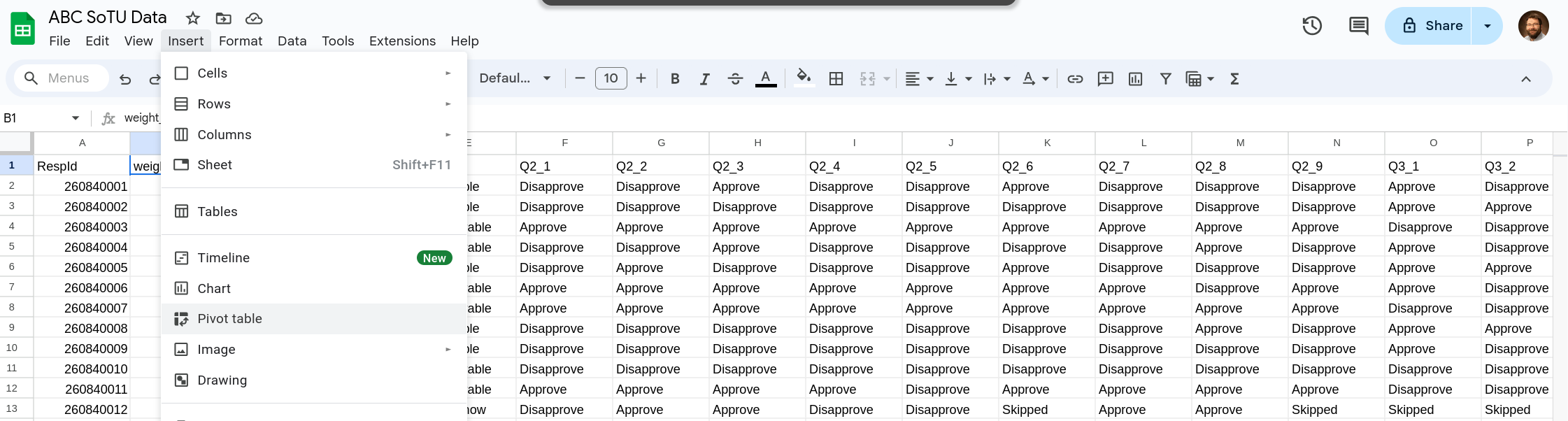 We will be using a pivot table to do our analysis. Pivot tables allow you to quickly aggregate your data in different ways and to create different aggregations for different groups. You’ll start by going to Insert