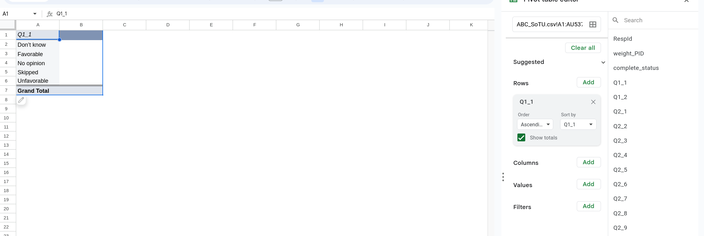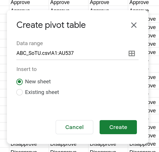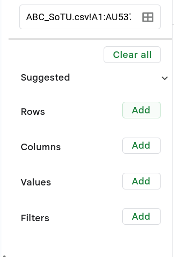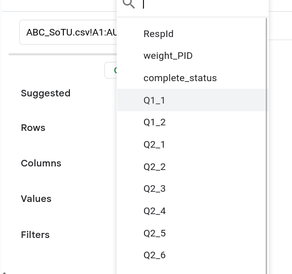 At this point you’ll have a new tab in your Google Sheet (near the bottom) and on the new tab you’ll have your pivot table. On the right side of the new tab you will have a new menu that has opened up (Figure 7). This is where you select variables (columns) that go into your pivot. You can add different variables as rows, values, or as “values”. When you add a variable to the rows (columns) it will use that to create rows (columns) out of the different categories it finds in that variable. The values is used to identify what to calculate in each of those rows (columns). You’ll see that once you select a variable in the values section you’ll have different options on how to use that variable (calculate the average, the sum, standard deviation, etc).