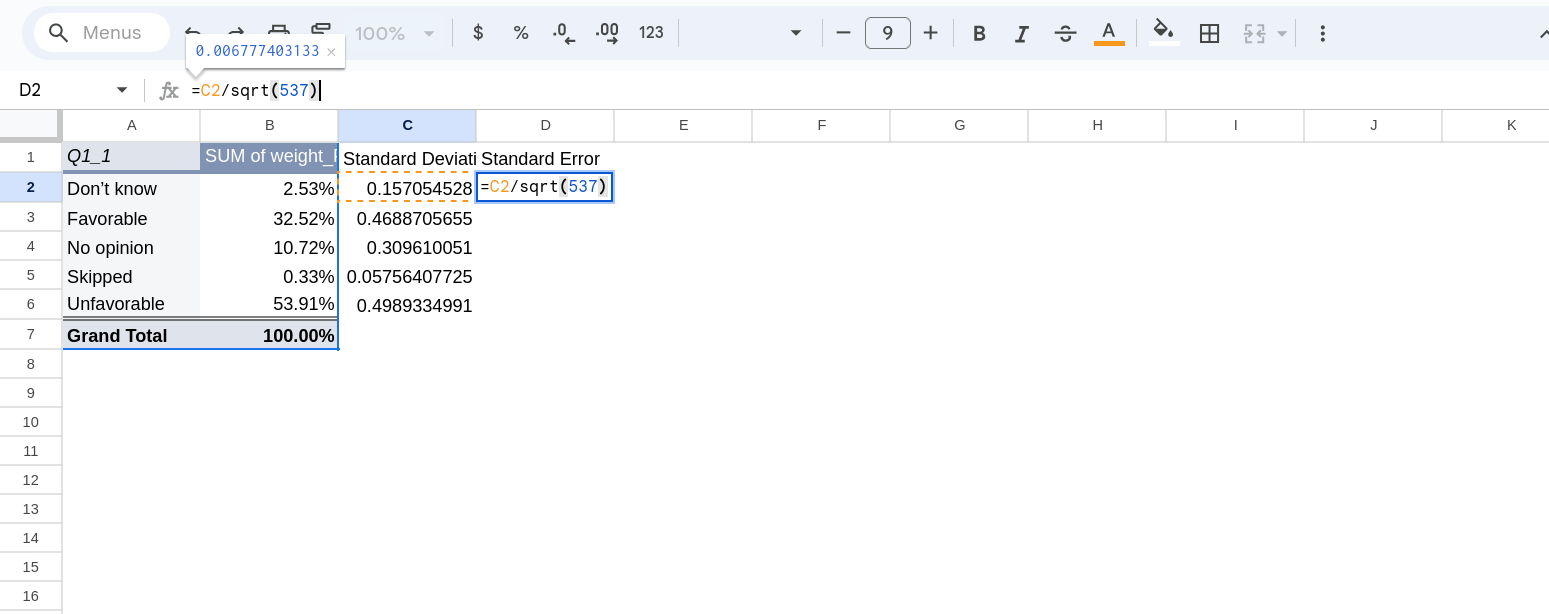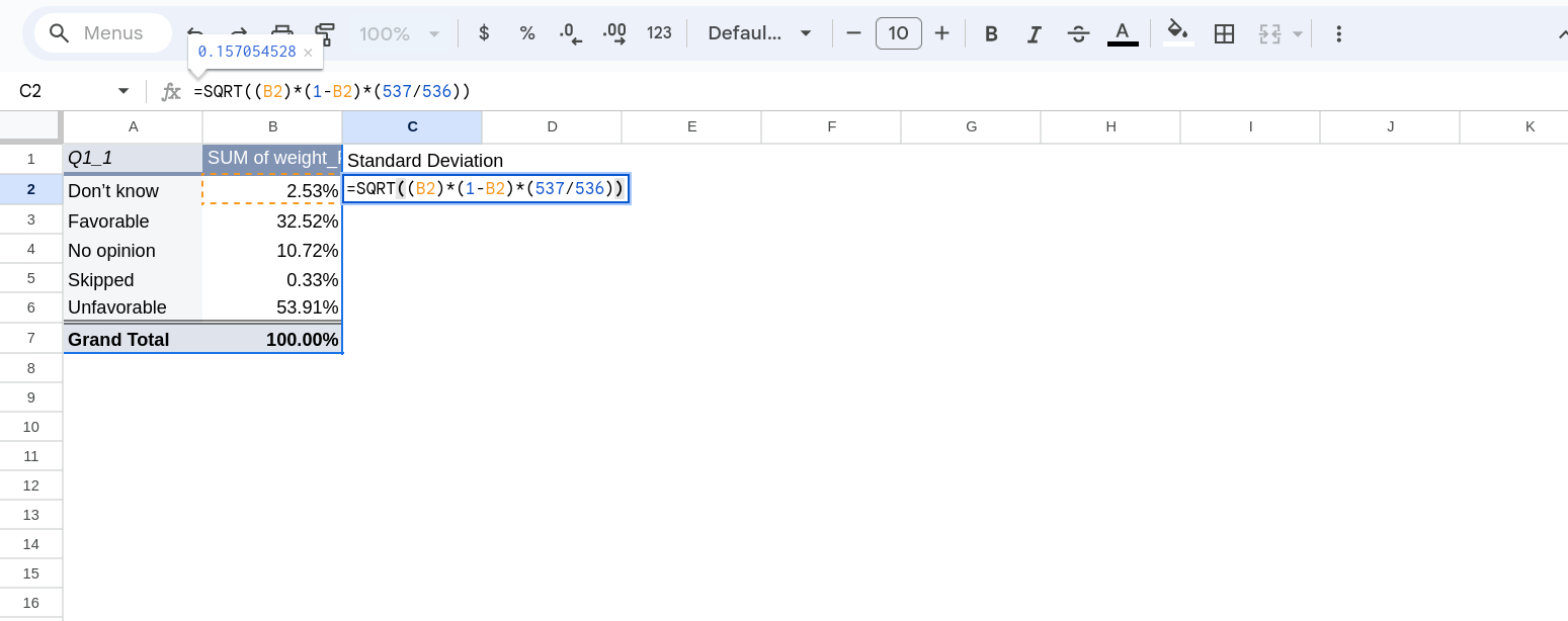 by (1-p) by again selecting the cell of interest. Finally multiply that by the number of rows divided by the number of rows minus 1 (putting the latter in parentheses). In full your formula should look something like: SQRT(B1*(1-B1)*(537/536))
