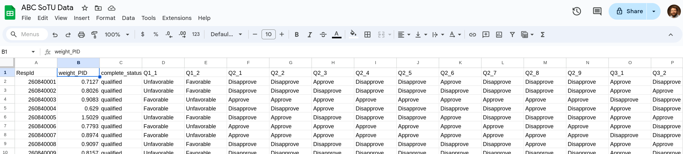 In order to fill in cells we need to add something to the the values. We are going to do this by adding the survey weights. In this case are survey weights are called weight_pid