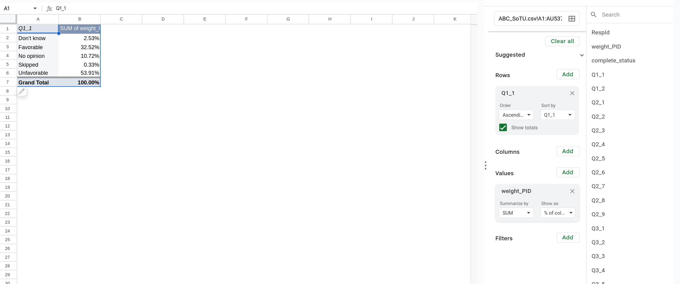Again what we are doing here is dividing our dataset by whatever we’ve selected in the Row section. We then add up the weight column in each division of the dataset. Finally we convert those sums into proportions/percentages as that’s what we are interested in.