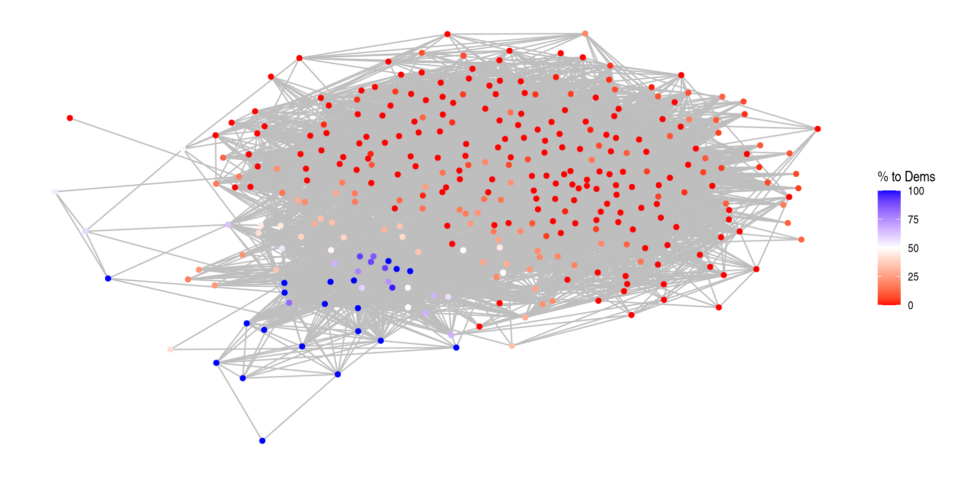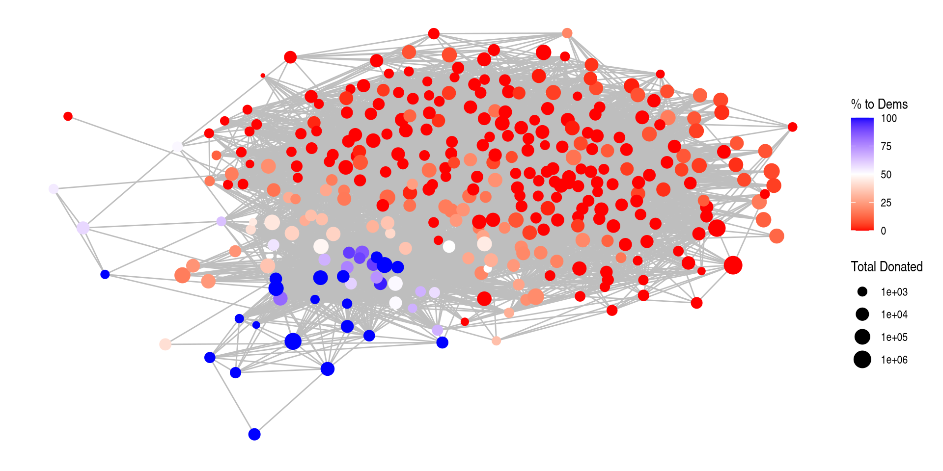 I don’t really care about the nodes themselves, what I care about is looking at how polarized this network is. There is a vertex attribute that shows the percentage of donations to Democratic candidates. Can we add that?