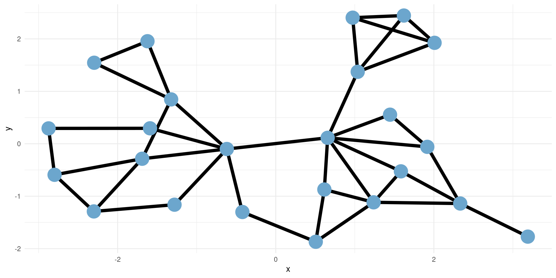 To add nodes and edges to this plot we will use geom_node_point() and geom_edge_link()
